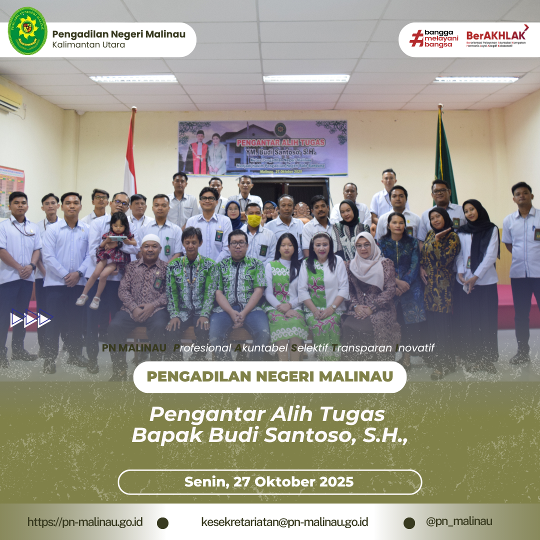 Seluruh keluarga besar Pengadilan Negeri Malinau mendoakan semoga Bapak Budi Santoso, S.H. senantiasa diberikan kesehatan, kesuksesan, dan kelancaran dalam menjalankan tugas di tempat yang baru, serta terus membawa semangat integritas dan profesionalisme di lingkungan peradilan.