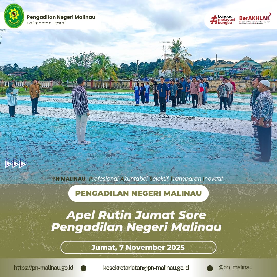 Pengadilan Negeri Malinau melaksanakan apel rutin Jumat sore di halaman kantor. Kegiatan ini merupakan agenda rutin sebagai bentuk disiplin aparatur serta ajang evaluasi terhadap pelaksanaan tugas selama satu minggu kerja.