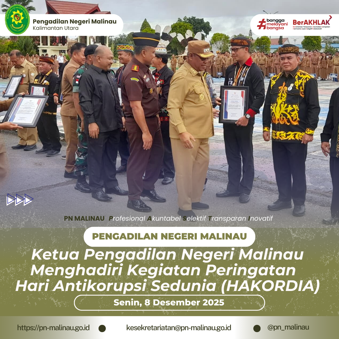 Ketua Pengadilan Negeri Malinau, Bapak Iwan Gunadi, S.H., menghadiri kegiatan Peringatan Hari Antikorupsi Dunia (HAKORDIA) Tahun 2025 sebagai bentuk komitmen nyata dalam mendukung gerakan nasional pencegahan dan pemberantasan tindak pidana korupsi. Kehadiran beliau menunjukkan dukungan penuh terhadap penguatan nilai-nilai integritas, transparansi, dan akuntabilitas dalam penyelenggaraan pemerintahan dan pelayanan publik.