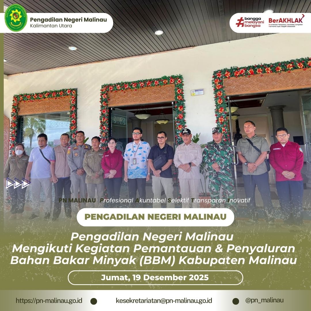 Pengadilan Negeri Malinau turut berpartisipasi dalam Kegiatan Pemantauan dan Penyaluran Bahan Bakar Minyak (BBM) di Kabupaten Malinau yang dilaksanakan pada Jumat, 19 Desember 2025. Dalam kegiatan tersebut, Pengadilan Negeri Malinau diwakili oleh Hakim Pengadilan Negeri Malinau, Bapak Rhendra Kusuma, S.H.
