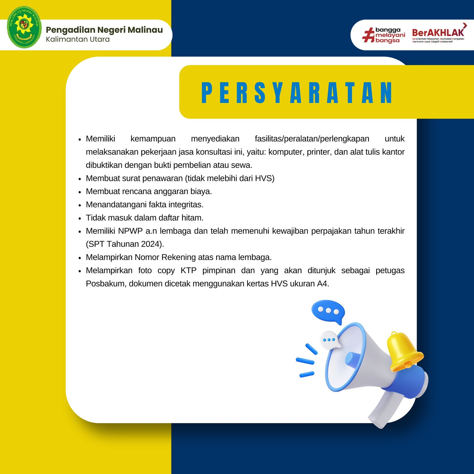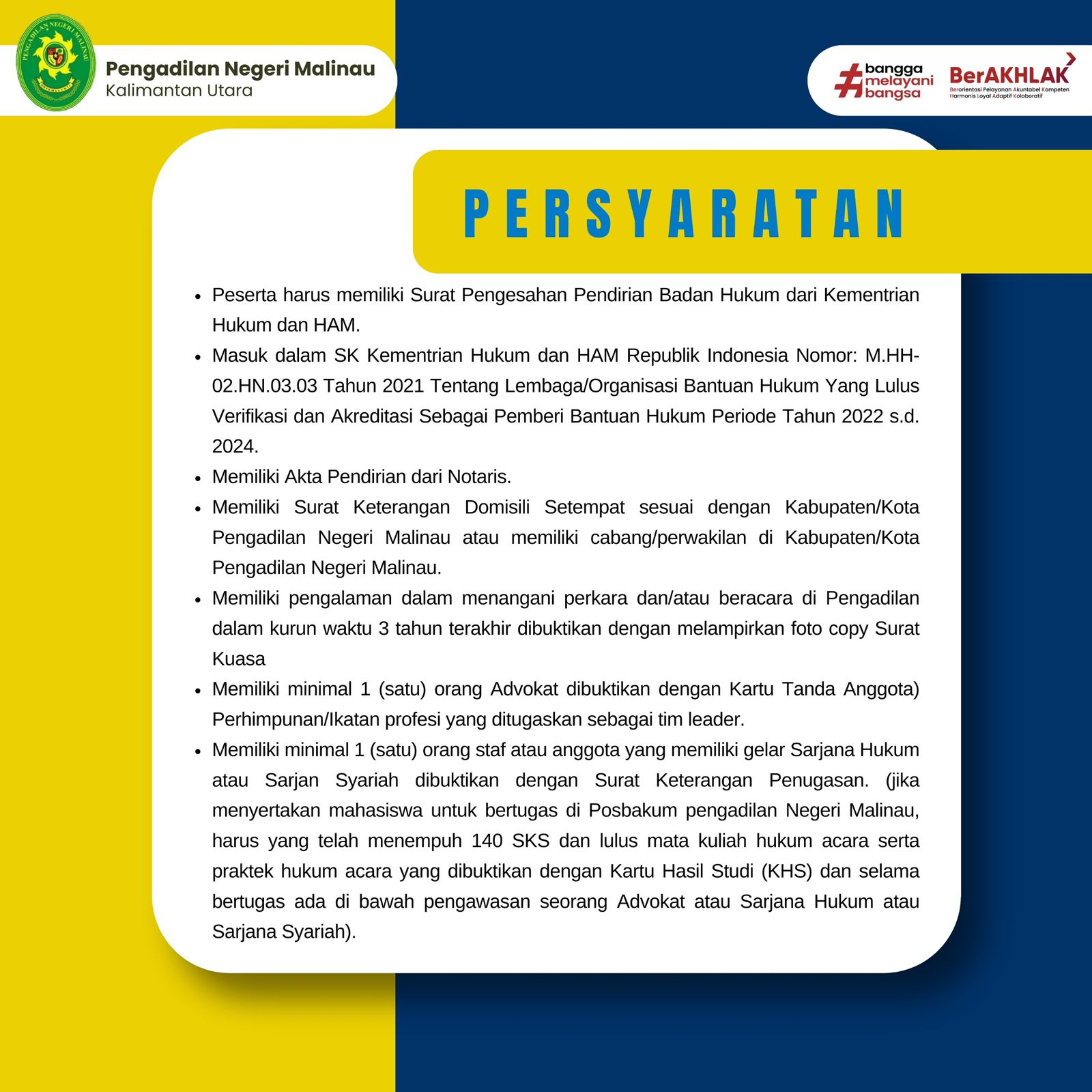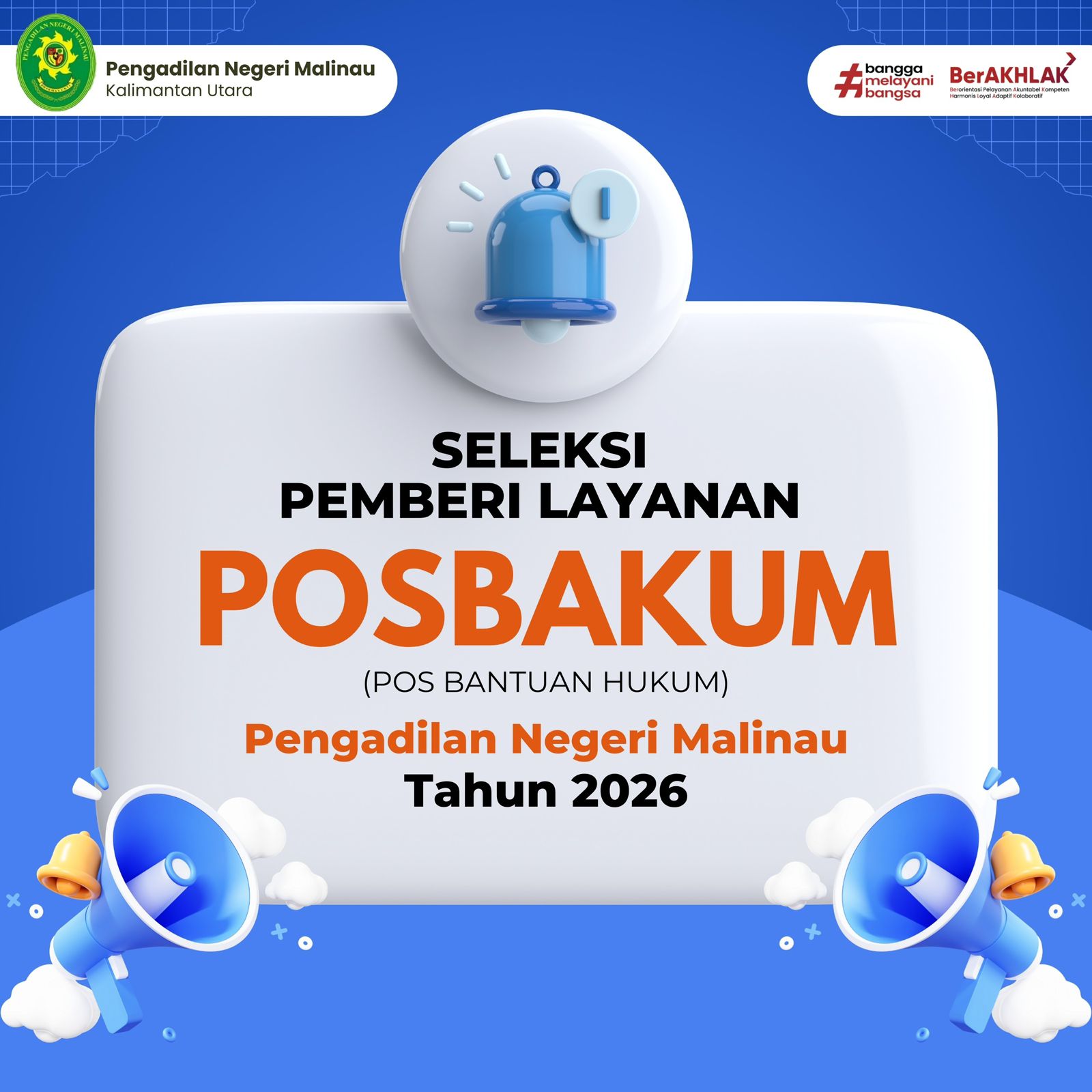 Malinau, Kalimantan Utara — Dalam rangka meningkatkan akses masyarakat terhadap keadilan serta memberikan layanan bantuan hukum yang optimal bagi pencari keadilan, Pengadilan Negeri Malinau membuka Seleksi Pemberi Layanan Pos Bantuan Hukum (Posbakum) Tahun Anggaran 2026.