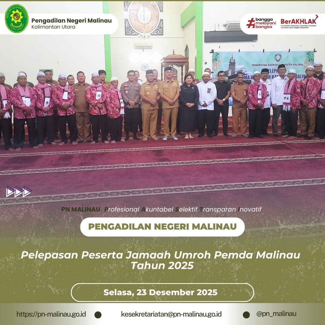 Ketua Pengadilan Negeri Malinau menghadiri kegiatan Pelepasan Peserta Jamaah Umroh Pemerintah Daerah Kabupaten Malinau Tahun 2025 yang dilaksanakan pada Selasa, 23 Desember 2025, bertempat di Masjid Agung Tanjung Belimbing.