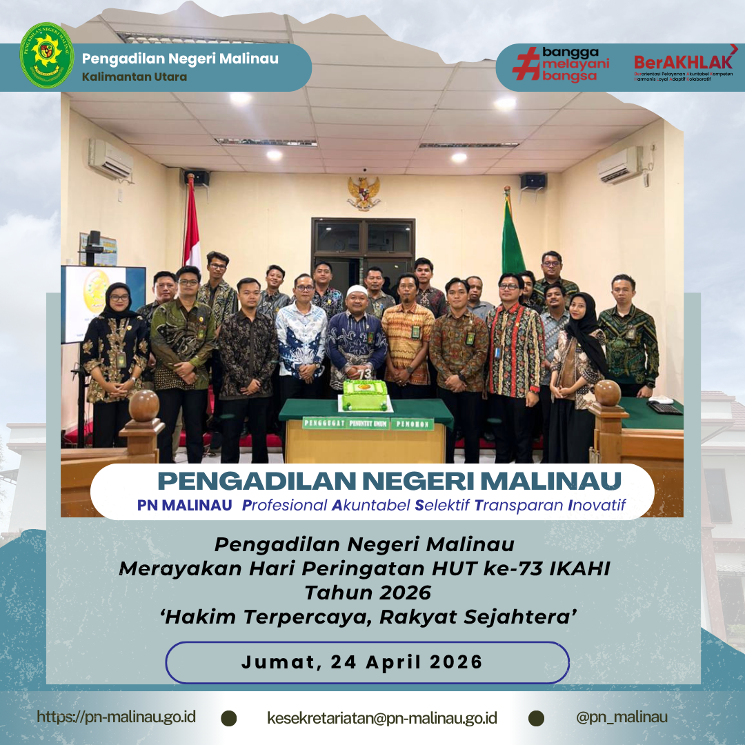 Pengadilan Negeri Malinau melaksanakan peringatan Hari Ulang Tahun Ikatan Hakim Indonesia (IKAHI) ke-73 Tahun 2026 dengan penuh kebersamaan dan semangat kekeluargaan. Kegiatan ini menjadi momentum untuk memperkuat integritas, solidaritas, serta profesionalisme hakim dan seluruh aparatur peradilan.