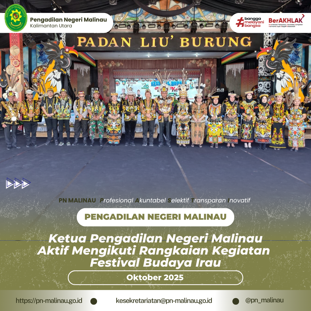 Malinau, Oktober 2025 – Ketua Pengadilan Negeri Malinau, Bapak Budi Santoso, S.H., beserta jajaran turut serta secara aktif dalam rangkaian kegiatan Festival Budaya Irau ke-11 Tahun 2025 yang digelar di Kabupaten Malinau, Kalimantan Utara.